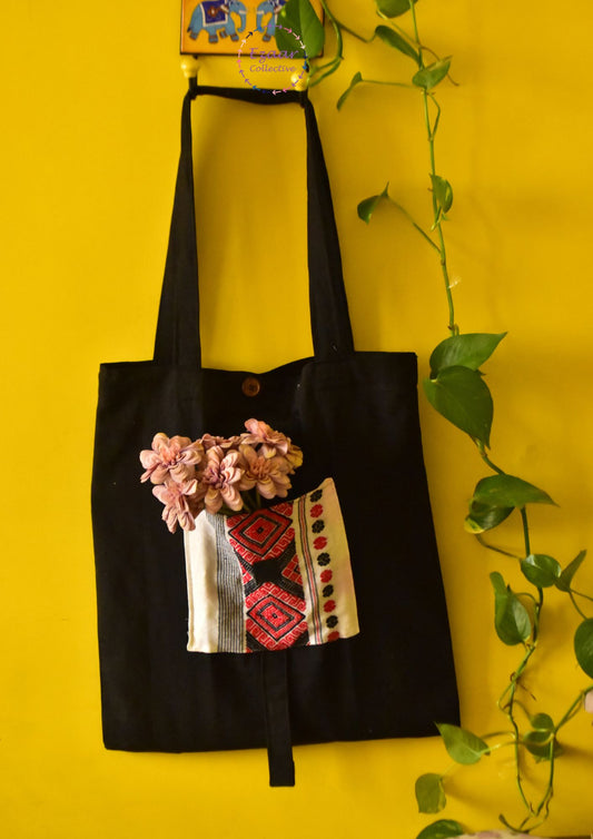 Our upcycled tote bag is a blend of sustainability and style, crafted from rich handloom...