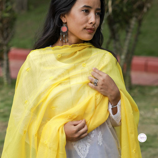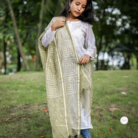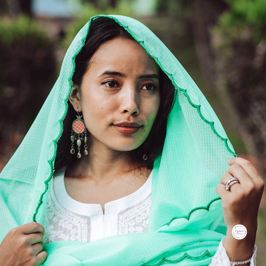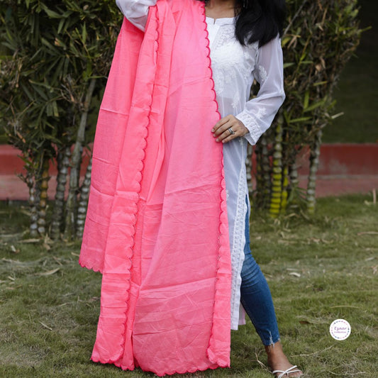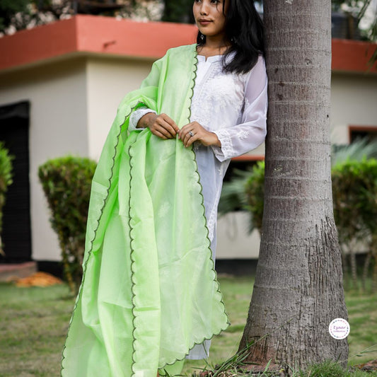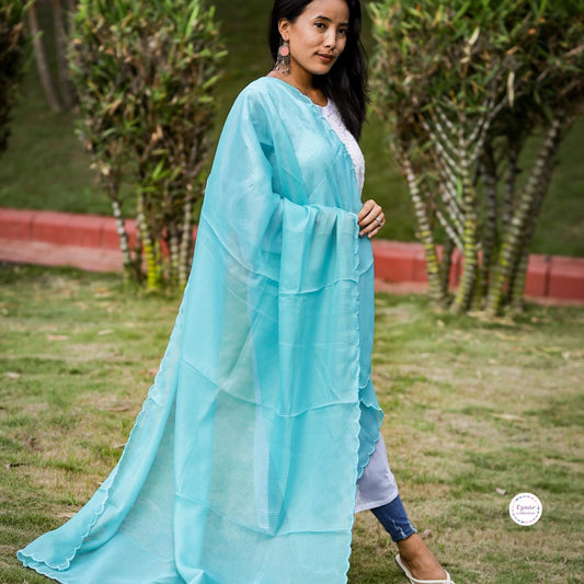 Experience the exquisite craftsmanship of our handcrafted Kota Doria Dupatta with beautiful scallop work, a...