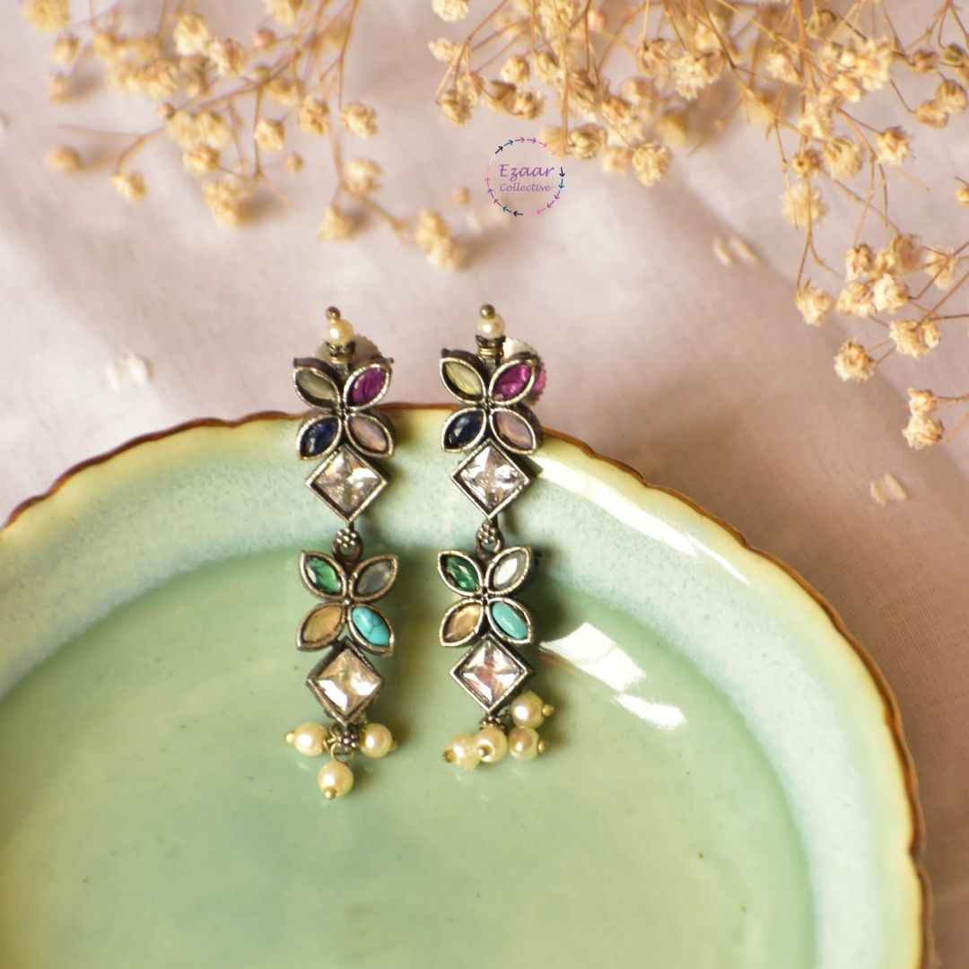 Elevate your ethnic charm with our silver lookalike earrings. Crafted with precision, these ornate earrings blend tradition and contemporary style effortlessly. The intricate design and lustrous brass metal give a timeless allure to your look. Perfect for weddings, festivals, or everyday elegance, these earrings make a statement of sophistication.