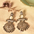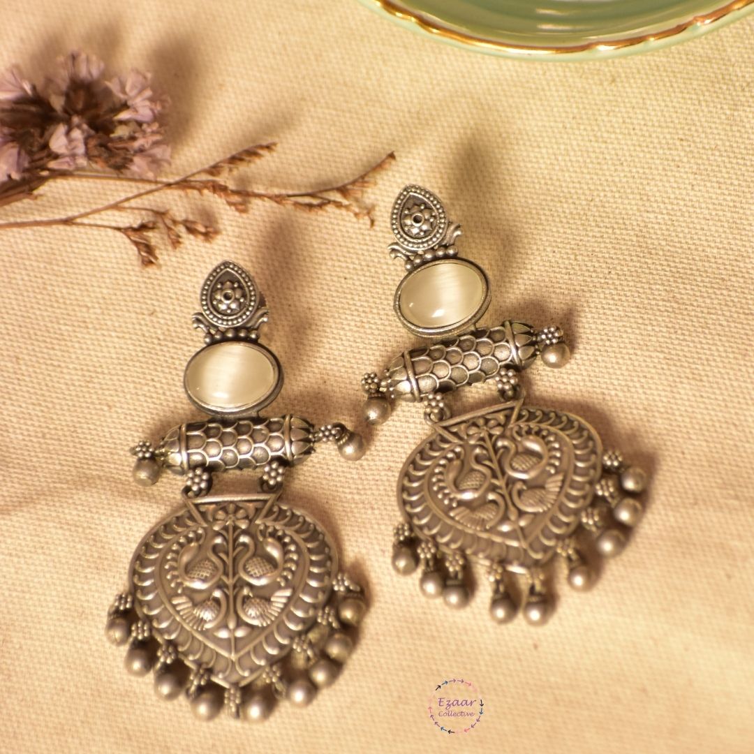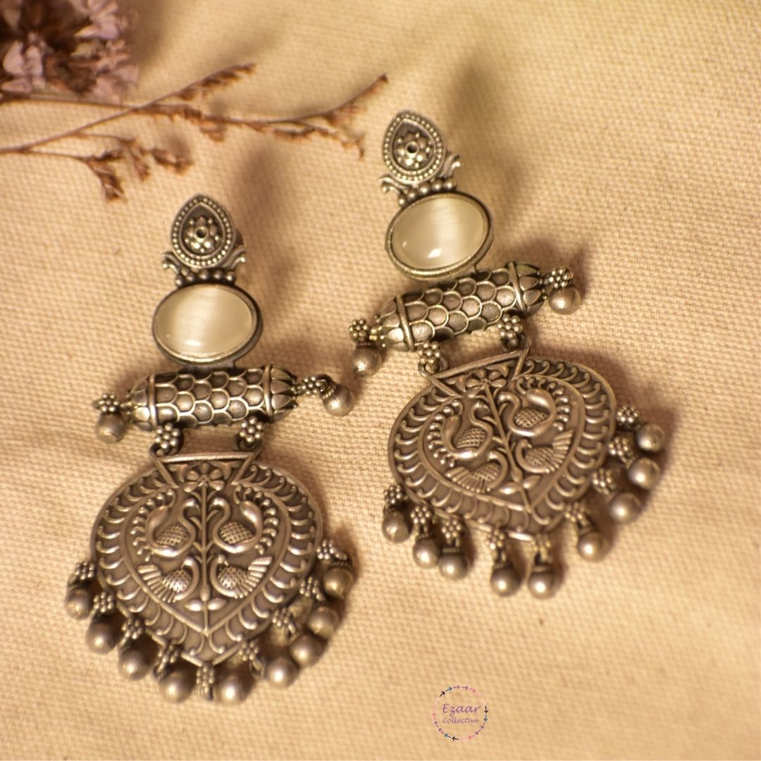 Elevate your ethnic charm with our exquisite silver lookalike earrings. Crafted with precision, these ornate earrings blend tradition and contemporary style effortlessly. The intricate design and lustrous brass metal give a timeless allure to your look. Perfect for weddings, festivals, or everyday elegance, these earrings make a statement of sophistication.