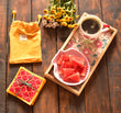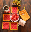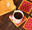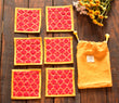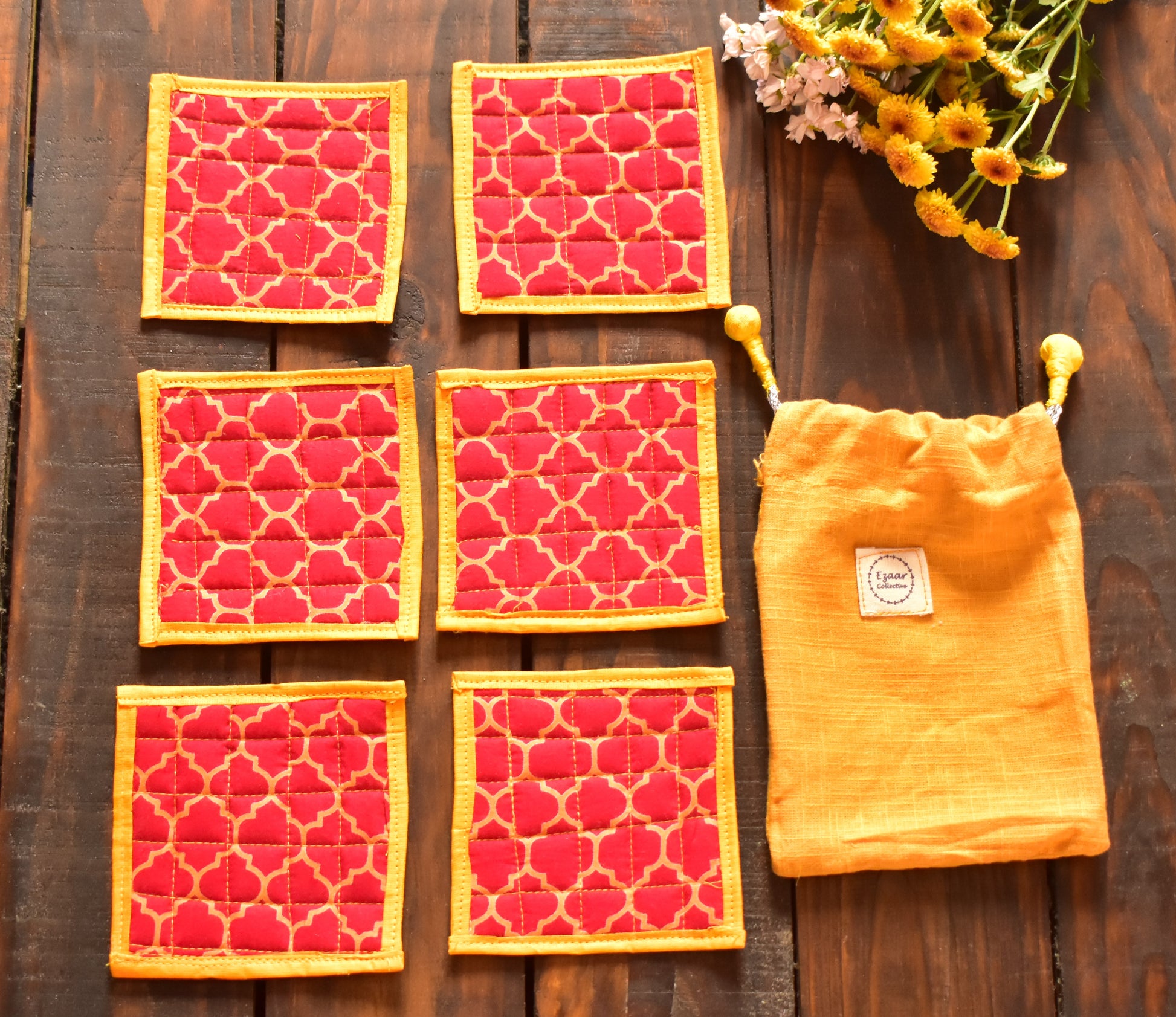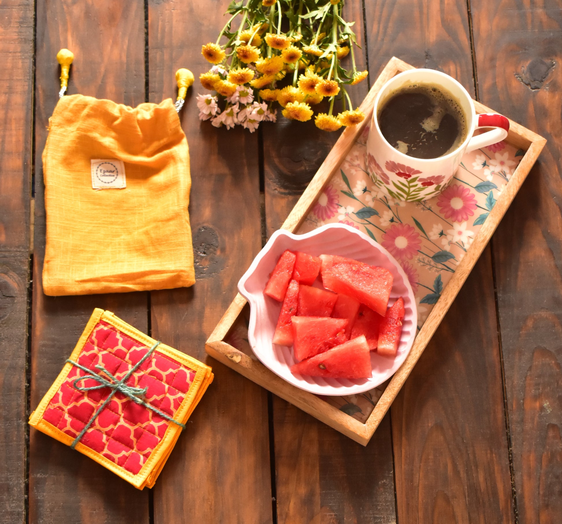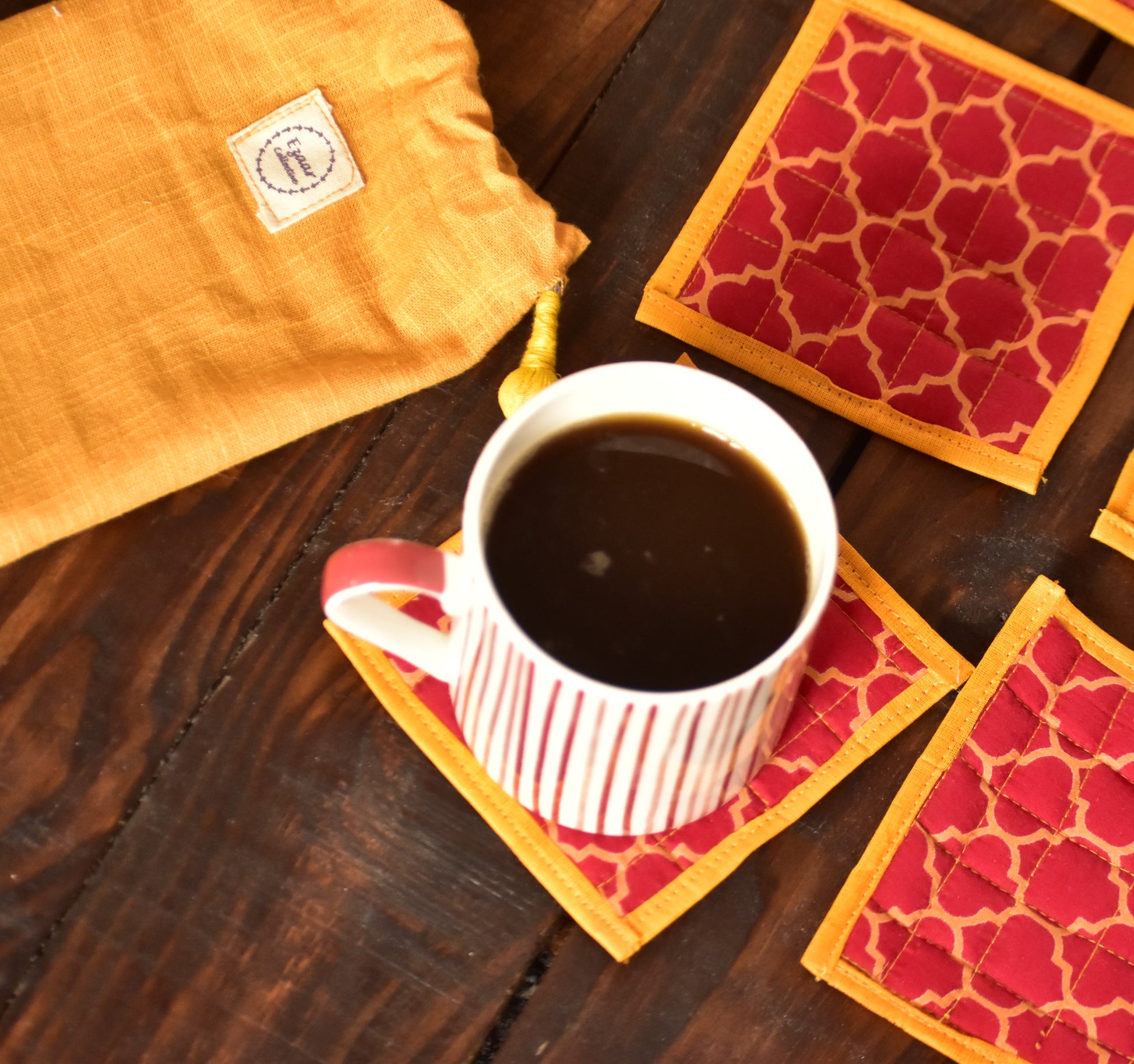Elevate your coffee table game with our Golden Bloom Coaster Set. These handmade zero-waste coasters are crafted from 100% cotton and come in a convenient pouch. With vibrant colors, this four-coaster set makes a great housewarming or family gift. Say goodbye to pesky condensation rings with these fabric coasters.