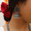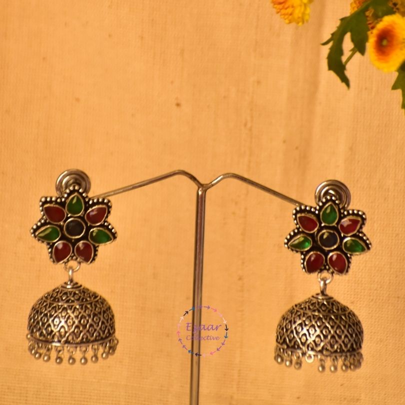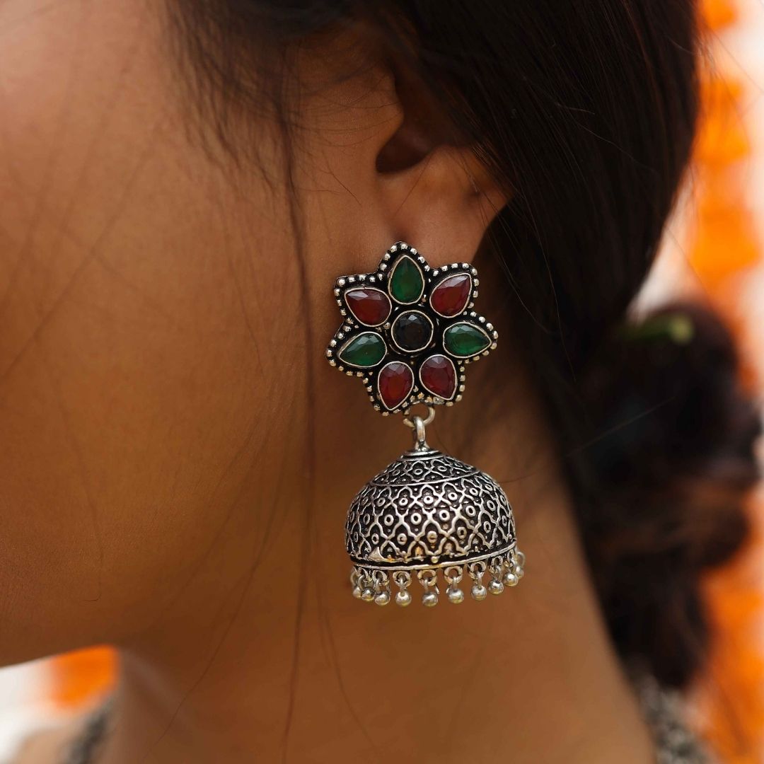 Elevate your ethnic charm with our silver lookalike jhumka earrings. Crafted with precision, these ornate earrings blend tradition and contemporary style effortlessly. The intricate design and lustrous brass metal give a timeless allure to your look. Perfect for weddings, festivals, or everyday elegance, these earrings make a statement of sophistication.