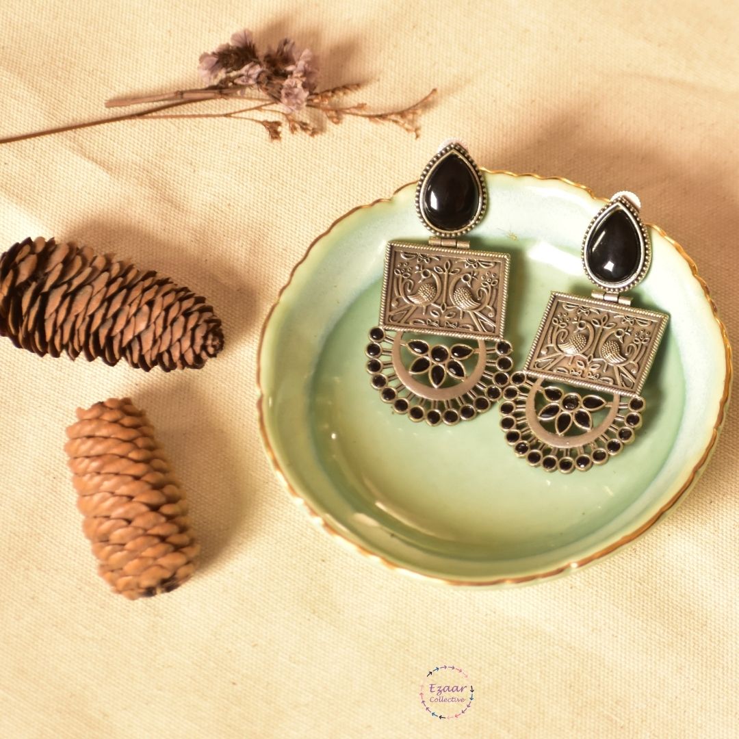 Elevate your ethnic charm with our purple silver lookalike earrings with black stones. Crafted with precision, these ornate earrings blend tradition and contemporary style effortlessly. The intricate design and lustrous brass metal give a timeless allure to your look. Perfect for weddings, festivals, or everyday elegance, these earrings make a statement of sophistication.